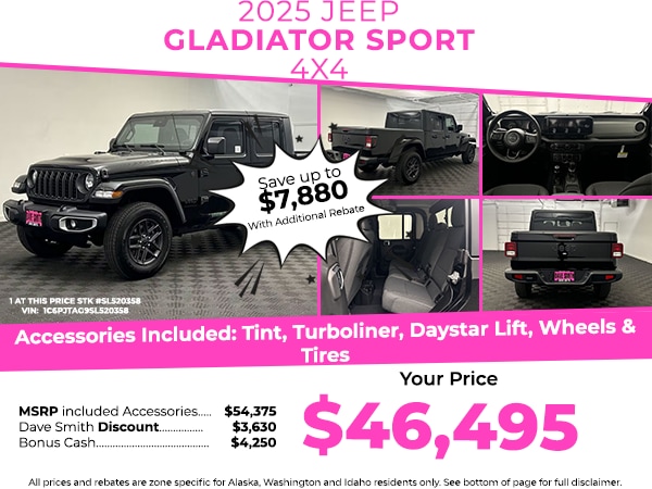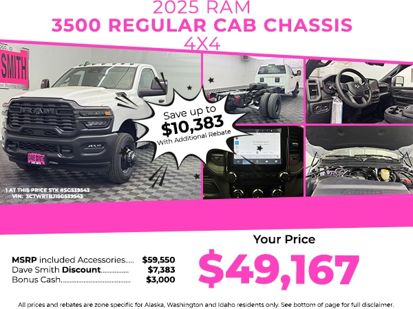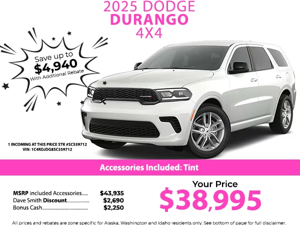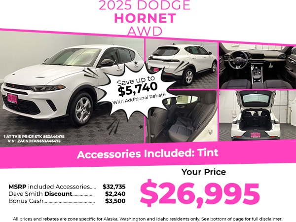 Prices shown are good for Idaho, Washington and Alaska residents only. Call dealer for rebates and pricing for different states. Not all customers will qualify for all rebates. All vehicles are subject to prior sale. Rebates as of 9/03/2025 and ad expires 9/30/2025 barring manufacturer rebate changes. Manufacturer retains the right to change incentives without notice, other restrictions apply. **Customer must finance through Stellantis Financial Services. Special APR financing offers may not be combined with disounted pricing or other promotional offers. *The Conquest vehicle must meet all eligable requirements. Customers may be eligible for either the discounted price or the special APR financing, but not both. Not responsible for typographical errors. Prices/payments are plus tax, license & negotiable $549.00 Dealer Documentation fee. File photos, not actual photos. Limit 1 per customer or up to dealer discretion. No sales to dealers, brokers or anyone who buys for the sole purpose of resale or export sales. The definition of hassle free buying is the customer choice to buy without the hassle of negotiating. See dealer for details.