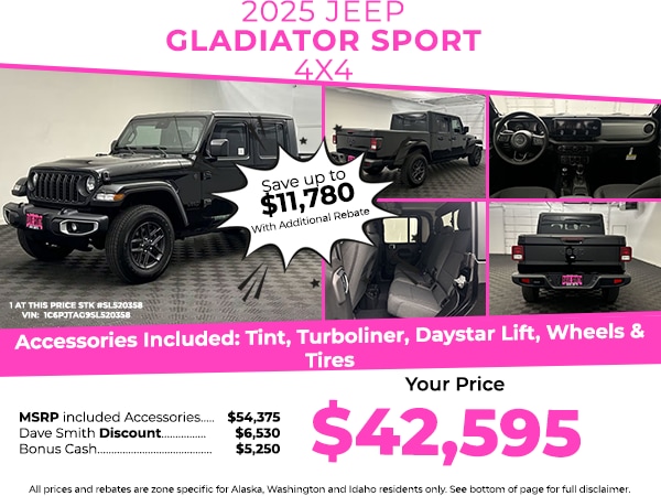 It's Forward Collision Warning feature alerts drivers to potential front-end collisions. This vehicle offers Apple CarPlay for seamless connectivity. This 2025 Jeep Gladiator keeps you comfortable with Auto Climate. Keep your hands warm all winter with a heated steering wheel in this 1/2 ton pickup . Never get into a cold vehicle again with the remote start feature on it. This model has auto-adjust speed for safe following. This unit offers Android Auto for seamless smartphone integration. This vehicle features a hands-free Bluetooth phone system. An off-road package is equipped on it. See what's behind you with the back up camera on the Jeep Gladiator. This 2025 Jeep Gladiator has a V6, 3.6L high output engine. Maintaining a stable interior temperature in the vehicle is easy with the climate control system. The vehicle is painted with a sleek and sophisticated black color. This unit has four wheel drive capabilities. This 2025 Jeep Gladiator is equipped with a gasoline engine.