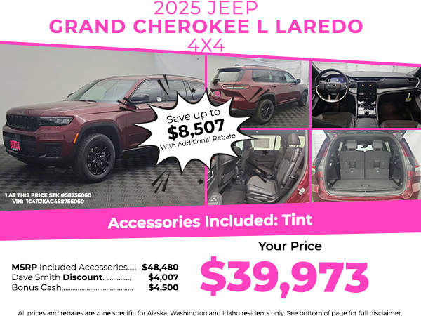 This vehicle's Forward Collision Warning system alerts the driver to potential front-end collisions, enhancing safety. Protect this mid-size suv from unwanted accidents with a cutting edge backup camera system. This model offers Android Auto for seamless smartphone integration. Apple CarPlay: Seamless smartphone integration for this model - stay connected and entertained on the go! This unit keeps you comfortable with Auto Climate. Bluetooth technology is built into this vehicle, keeping your hands on the steering wheel and your focus on the road. This Jeep Grand Cherokee L has automated speed control that adjusts to maintain a safe following distance, enhancing highway driving convenience. Never get into a cold vehicle again with the remote start feature on this vehicle. The leather seats in this vehicle are a must for buyers looking for comfort, durability, and style. Keep your hands warm all winter with a heated steering wheel in this 2025 Jeep Grand Cherokee L .