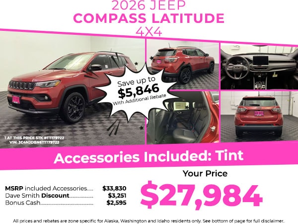 Never get into a cold vehicle again with the remote start feature on this mid-size suv. The Jeep Compass is equipped with the latest generation of XM/Sirius Radio. This 2026 Jeep Compass is pure luxury with a heated steering wheel. Protect this vehicle from unwanted accidents with a cutting edge backup camera system. Bluetooth technology is built into this unit, keeping your hands on the steering wheel and your focus on the road. This vehicle offers Automatic Climate Control for personalized comfort. It's Forward Collision Warning feature alerts drivers to potential front-end collisions. Enjoy the convenience of the power liftgate on this 2026 Jeep Compass . Set the temperature exactly where you are most comfortable in it. The fan speed and temperature will automatically adjust to maintain your preferred zone climate. This mid-size suv excites both driver and bystanders with a polished red exterior with racy lines. The vehicle has a 4 Cyl, 2.0L high output engine.