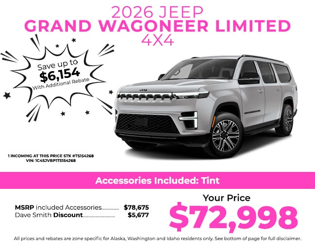 The Jeep Grand Wagoneer has automated speed control that adjusts to maintain a safe following distance, enhancing highway driving convenience. This model comes equipped with Android Auto for seamless smartphone integration on the road. This model is pure luxury with a heated steering wheel. It features a hands-free Bluetooth phone system. Apple CarPlay: Seamless smartphone integration for this vehicle - stay connected and entertained on the go! The installed navigation system will keep you on the right path. Start this model from inside with remote start. Protect this Jeep Grand Wagoneer from unwanted accidents with a cutting edge backup camera system. This 2026 Jeep Grand Wagoneer 's Forward Collision Warning system alerts the driver to potential front-end collisions, enhancing safety. The leather seats in it are a must for buyers looking for comfort, durability, and style. This Jeep Grand Wagoneer has four wheel drive capabilities. The Jeep Grand Wagoneer gleams with an elegant silver clear coated finish.