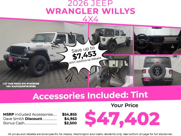 Protect the vehicle from unwanted accidents with a cutting edge backup camera system. Bluetooth technology is built into this 2026 Jeep Wrangler , keeping your hands on the steering wheel and your focus on the road. The vehicle has automated speed control that adjusts to maintain a safe following distance, enhancing highway driving convenience. Never get into a cold vehicle again with the remote start feature on this Jeep Wrangler. Keep your hands warm all winter with a heated steering wheel in this Jeep Wrangler . This vehicle keeps you comfortable with Auto Climate. An off-road package is equipped on this unit. The vehicle comes equipped with Android Auto for seamless smartphone integration on the road. This mid-size suv's Forward Collision Warning feature alerts drivers to potential front-end collisions. This model offers Apple CarPlay for seamless connectivity. This unit shines with clean polished lines coated with an elegant white finish.