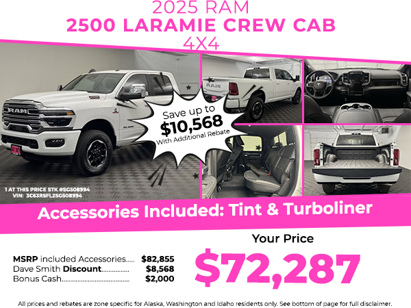 Cold Weather Group: Engine Block Heater; MOPAR Winter Front Grille Cover. Laramie Level 1 Equipment Group: Forward and Reverse Utility Lights; Rain Sensitive Windshield Wipers; Power Adjustable Pedals with Memory; Power Heated Fold Telescopic Mirrors with Memory; Exterior Mirrors with Supplemental Signals; Exterior Mirrors Courtesy Lamps; Auto Power-Folding Mirrors; Remote Tailgate Release; Exterior Mirrors with Heating Element; Auto Dim Exterior Mirror; Anti-Spin Differential Rear Axle; Auto High Beam Headlamp Control; Chrome Exterior Mirrors; Exterior Mirrors with Memory; Mirror Running Lights; Foam Bottle Insert (door Trim Panel); Power Adjust Mirrors; 2nd Row in Floor Storage Bins; Power Telescoping Mirrors; Auto Dim Exterior Passenger Mirror; Auto Adjust in Reverse Exterior Mirrors; Power Adjustable Convex Aux Mirrors. Quick Order Package 24H Laramie. Towing Technology Group: Center Stop Lamp with Cargo View Camera; Surround View Camera System; Trailer Tire Pressure Monitoring System; Trailer Reverse Guidance. Center Stop Lamp with Cargo View Camera. **Equipment listed is based on original vehicle build and subject to change. Please confirm the accuracy of the included equipment by calling the dealer prior to purchase.**