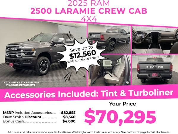 This vehicle is equipped with the latest generation of XM/Sirius Radio. This Ram 2500's Forward Collision Warning feature alerts drivers to potential front-end collisions. The installed navigation system will keep you on the right path. Apple CarPlay: Seamless smartphone integration for this vehicle - stay connected and entertained on the go! The leather seats in this 2025 Ram 2500 are a must for buyers looking for comfort, durability, and style. This 3/4 ton pickup offers Android Auto for seamless smartphone integration. This Ram 2500 has a premium sound system installed. Bluetooth technology is built into the Ram 2500, keeping your hands on the steering wheel and your focus on the road. Start this vehicle from inside with remote start. This model is pure luxury with a heated steering wheel. Protect this model from unwanted accidents with a cutting edge backup camera system. An off-road package is installed on the Ram 2500 so you are ready for your four-wheeling best.