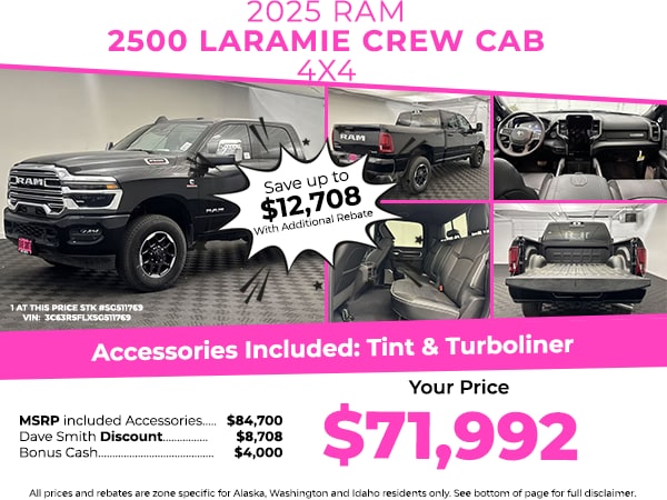 You'll never again be lost in a crowded city or a country region with the navigation system on this model. The leather seats in this 3/4 ton pickup are a must for buyers looking for comfort, durability, and style. Bluetooth technology is built into this vehicle, keeping your hands on the steering wheel and your focus on the road. An off-road package is equipped on it. Enjoy your music even more with the premium sound system in this Ram 2500. This Ram 2500 has automated speed control that adjusts to maintain a safe following distance, enhancing highway driving convenience. This 3/4 ton pickup's Forward Collision Warning system alerts the driver to potential front-end collisions, enhancing safety. This model is equipped with the latest generation of XM/Sirius Radio. This model offers Apple CarPlay for seamless connectivity. The vehicle comes equipped with Android Auto for seamless smartphone integration on the road. Protect this vehicle from unwanted accidents with a cutting edge backup camera system.