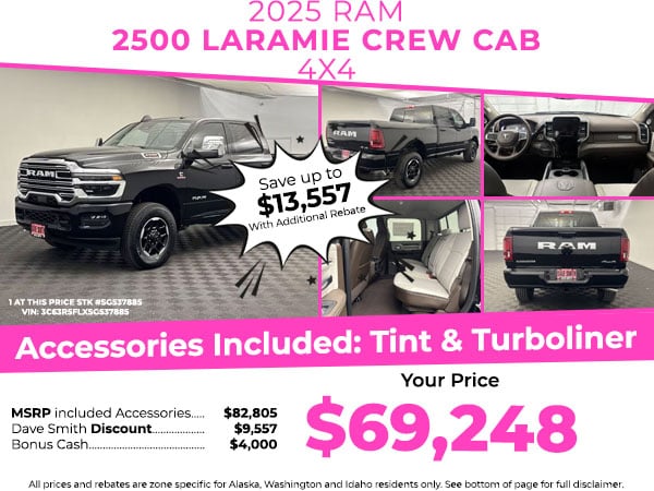 Keep your hands warm all winter with a heated steering wheel in it . The vehicle is equipped with the latest generation of XM/Sirius Radio. This model offers Apple CarPlay for seamless connectivity. The installed navigation system will keep you on the right path. The vehicle has a premium sound system installed. This 2025 Ram 2500 's Forward Collision Warning feature alerts drivers to potential front-end collisions. The vehicle offers Android Auto for seamless smartphone integration. This 3/4 ton pickup has auto-adjust speed for safe following. The leather seats in this 2025 Ram 2500 are a must for buyers looking for comfort, durability, and style. An off-road package is installed on it so you are ready for your four-wheeling best. See what's behind you with the back up camera on the vehicle. This 3/4 ton pickup features a hands-free Bluetooth phone system. This Ram 2500 has a 6 Cyl, 6.7L high output engine.
