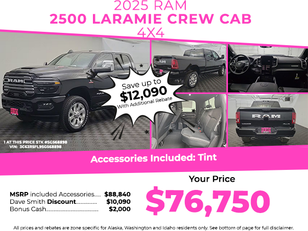 Cold Weather Group: Engine Block Heater; MOPAR Winter Front Grille Cover. Laramie Level 2 Plus Equipment Group: Google Android Auto; SiriusXM Radio Service; Power Adjustable Pedals with Memory; Integrated Voice Command with Bluetooth; Emergency Vehicle Alert System (EVAS); Power Deployable Running Boards; Auto Power-Folding Mirrors; Anti-Spin Differential Rear Axle; Mirror Running Lights; Drowsy Driver Detection; MOPAR Deployable Bed Step; Alexa Built-In; Apple CarPlay; Power Adjustable Convex Aux Mirrors; Active Lane Management System; Forward and Reverse Utility Lights; Disassociated Touchscreen Display; Remote Tailgate Release; 17 Speaker Harman/kardon Premium Sound; 2nd Row in Floor Storage Bins; Center Stop Lamp with Cargo View Camera; Rain Sensitive Windshield Wipers; LED Bed Lighting; Traffic Sign Recognition; Connectivity - US/Canada; GPS Navigation; 4G LTE Wi-Fi Hot Spot; Adaptive Steering System; GPS Antenna Input; Exterior Mirrors with Heating Element; Auto Dim Exterior Mirror; SiriusXM with 360L; Global Telematics Box Module; Connected Travel and Traffic Services; Foam Bottle Insert (door Trim Panel); Off-Road Info Pages; Selectable Tire Fill Alert; Trailer Tow Pages; Leather Trimmed Bucket Seats; HD Radio; 14.4 Touchscreen Display; Power Heated Fold Telescopic Mirrors with Memory; Exterior Mirrors with Supplemental Signals; Exterior Mirrors Courtesy Lamps; Uconnect 5 Nav with 14.4 Display; MOPAR Spray in Bedliner; Auto High Beam Headlamp Control; Chrome Exterior Mirrors; Exterior Mirrors with Memory; Power Adjust Mirrors; Power Telescoping Mirrors; Auto Dim Exterior Passenger Mirror; Auto Adjust in Reverse Exterior Mirrors. Quick Order Package 24H Laramie. Off Road Package: Front Performance Tuned Shock Absorbers; Transfer Case Skid Plate Shield; Hill Descent Control; Rear Performance Tuned Shock Absorbers. Sport Appearance Package: LT285/60R20E OWL On/off Road Tires; Center Hub; Body Color Grille Surround; Sport Performance Hood; Sport Decal; 20 X 8.0 Diamond Cut Face Aluminum Wheels. Power Sunroof. Power Deployable Running Boards. Leather Trimmed Bucket Seats. Center Stop Lamp with Cargo View Camera. Diamond Black Crystal PC. Transfer Case Skid Plate Shield. **Equipment listed is based on original vehicle build and subject to change. Please confirm the accuracy of the included equipment by calling the dealer prior to purchase.**