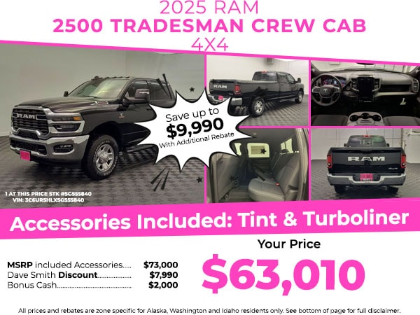 Tradesman Level 2 Equipment Group: Google Android Auto; SiriusXM Radio Service; Integrated Voice Command with Bluetooth; Emergency Vehicle Alert System (EVAS); Manual Folding Exterior Mirrors; 12 Touchscreen Display; Anti-Spin Differential Rear Axle; Mirror Running Lights; Exterior 115V AC Outlet; Alexa Built-In; Apple CarPlay; Power Adjustable Convex Aux Mirrors; Cloth 40/20/40 Bench Seat; Disassociated Touchscreen Display; Matte Black Mesh Grille with Chrome; 115-Volt Auxiliary Front Power Outlet; Center Hub; Rear View Auto Dim Mirror; Rear Power Sliding Window; Connectivity - US/Canada; Tinted Acoustic Windshield Glass; GPS Navigation; 4G LTE Wi-Fi Hot Spot; GPS Antenna Input; Bright Rear Bumper; Exterior Mirrors with Heating Element; MOPAR Black Tubular Side Steps; Chrome Grille Surround; SiriusXM with 360L; Global Telematics Box Module; Connected Travel and Traffic Services; Black Exterior Mirrors; Carpet Floor Covering; 18 X 8.0 Steel Chrome Clad Wheels; Off-Road Info Pages; Selectable Tire Fill Alert; Trailer Tow Pages; 400W Inverter; HD Radio; Power Heated Folding Telescope Mirrors; Uconnect 5 Navigation with 12.0 Display Radio; Exterior Mirrors with Supplemental Signals; Exterior Mirrors Courtesy Lamps; Air Conditioning ATC with Dual Zone Control; Manuarl Telescoping Mirrors; Power Adjust Mirrors; 18 Steel Spare Wheel; Front and Rear Floor Mats; ParkSense Front/rear Park Assist System; Bright Front Bumper. Convenience Group. Quick Order Package 24A Tradesman. MOPAR Black Tubular Side Steps. 5th Wheel/gooseneck Towing Prep Group. Anti-Spin Differential Rear Axle. Cloth 40/20/40 Bench Seat. LT275/70R18E OWL On/off Road Tires. 50 Gallon Fuel Tank. Diamond Black Crystal PC. MOPAR Front and Rear Rubber Floor Mats. Clearance Lamps. Transfer Case Skid Plate Shield. **Equipment listed is based on original vehicle build and subject to change. Please confirm the accuracy of the included equipment by calling the dealer prior to purchase.**