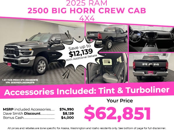 Quick Order Package 24Z Big Horn. Big Horn Level 2 Equipment Group: Blind Spot and Cross Path Detection; Rear View Auto Dim Mirror; Power Adjustable Pedals; Rear Power Sliding Window; Rear Dome with On/off Switch Lamp; Glove Box Lamp; Auto Power-Folding Mirrors; Footwell Courtesy Lamp; 115V Auxiliary Rear Power Outlet; Media Hub with 2 Charge Only USBs; Exterior Mirrors with Heating Element; Anti-Spin Differential Rear Axle; Heated Front Seats; Mirror Running Lights; Heated Steering Wheel; Foam Bottle Insert (door Trim Panel); Black Exterior Mirrors; Exterior 115V AC Outlet; Dampened Tailgate; Premium Cloth Bucket Seats; Big Horn Instrument Panel Badge; Power Adjustable Convex Aux Mirrors; Forward and Reverse Utility Lights; Locking Lower Glove Box; Remote Start System; 400W Inverter; 9 Alpine Speakers with Subwoofer; Power Heated Folding Telescopic Mirrors; Dual Wireless Charging Pad; Exterior Mirrors with Supplemental Signals; Steering Wheel Mounted Audio Controls; Exterior Mirrors Courtesy Lamps; Dual Glove Boxes; 115-Volt Auxiliary Front Power Outlet; Cluster 7.0 TFT Color Display; Universal Garage Door Opener; Power Adjust Mirrors; Luxury Steering Wheel; 2nd Row in Floor Storage Bins; Power Telescoping Mirrors; Sun Visors with Illuminated Vanity Mirrors. Cold Weather Group: Engine Block Heater; MOPAR Winter Front Grille Cover. Blind Spot and Cross Path Detection. Anti-Spin Differential Rear Axle. Premium Cloth Bucket Seats. Remote Start System. Diamond Black Crystal PC. Power 2-Way Driver Lumbar Adjust. **Equipment listed is based on original vehicle build and subject to change. Please confirm the accuracy of the included equipment by calling the dealer prior to purchase.**