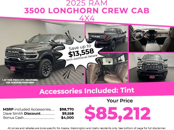 Cold Weather Group: Engine Block Heater; MOPAR Winter Front Grille Cover. Longhorn Level 1 Equipment Group: Active Lane Management System; MOPAR Spray in Bedliner; Center Stop Lamp with Cargo View Camera; Surround View Camera System; Drowsy Driver Detection; LED Bed Lighting; Power Deployable Running Boards; Traffic Sign Recognition; Trailer Tire Pressure Monitoring System; Trailer Reverse Guidance; Digital Rearview Mirror; Adaptive Steering System. Quick Order Package 24K Longhorn: Longhorn Instrument Cluster Theme 3. Power Sunroof. Diamond Black Crystal PC. **Equipment listed is based on original vehicle build and subject to change. Please confirm the accuracy of the included equipment by calling the dealer prior to purchase.**