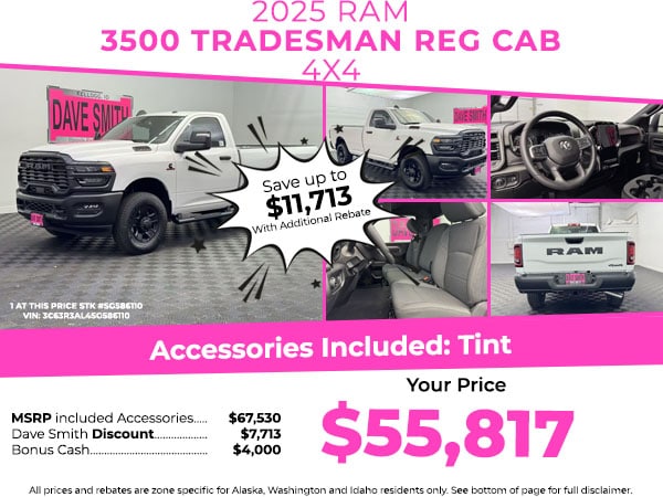 Cold Weather Group: Engine Block Heater; MOPAR Winter Front Grille Cover. Quick Order Package 24A Tradesman. Tradesman Level 1 Equipment Group: Convenience Group; Google Android Auto; SiriusXM Radio Service; Speed Sensitive Power Locks; Rear Sliding Window; Rear View Auto Dim Mirror; For Details Visit DriveUconnect.com; For More Info. Call 800-643-2112; Integrated Voice Command with Bluetooth; Upgraded Door Trim Panel; Connectivity - US/Canada; Emergency Vehicle Alert System (EVAS); Manual Folding Exterior Mirrors; 12 Touchscreen Display; Tinted Acoustic Windshield Glass; GPS Navigation; 4G LTE Wi-Fi Hot Spot; GPS Antenna Input; Exterior Mirrors with Heating Element; MOPAR Black Tubular Side Steps; Front 1-Touch Down Power Windows; SiriusXM with 360L; Active Noise Control System; Global Telematics Box Module; Connected Travel and Traffic Services; Mirror Running Lights; Black Exterior Mirrors; Alexa Built-In; Carpet Floor Covering; Apple CarPlay; Power-Adjustable Convex Aux Mirrors; Off-Road Information Pages; Selectable Tire Fill Alert; Trailer Tow Pages; Cloth 40/20/40 Bench Seat; Disassociated Touchscreen Display; HD Radio; Power Heat Fold Telescope Mirrors; Uconnect 5 Navigation with 12.0 Display Radio; Exterior Mirrors with Supplemental Signals; Exterior Mirrors Courtesy Lamps; Air Conditioning ATC with Dual Zone Control; 6 Speakers; Manuarl Telescoping Mirrors; Front Floor Mats; Power Adjust Mirrors; Remote Keyless Entry. Commercial Features Package: 400W Inverter; 115-Volt Auxiliary Front Power Outlet; Exterior 115V AC Outlet; ParkSense Front/rear Park Assist System. MOPAR Black Tubular Side Steps. Cloth 40/20/40 Bench Seat. **Equipment listed is based on original vehicle build and subject to change. Please confirm the accuracy of the included equipment by calling the dealer prior to purchase.**