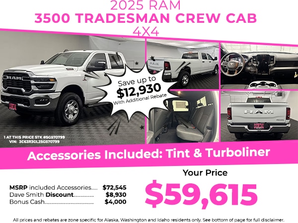 Cold Weather Group: Engine Block Heater; MOPAR Winter Front Grille Cover. Quick Order Package 24A Tradesman. Tradesman Level 2 Equipment Group: Convenience Group; Google Android Auto; SiriusXM Radio Service; For Details Visit DriveUconnect.com; For More Info. Call 800-643-2112; Integrated Voice Command with Bluetooth; Emergency Vehicle Alert System (EVAS); Manual Folding Exterior Mirrors; 12 Touchscreen Display; Mirror Running Lights; Exterior 115V AC Outlet; Alexa Built-In; Apple CarPlay; Power-Adjustable Convex Aux Mirrors; Cloth 40/20/40 Bench Seat; Disassociated Touchscreen Display; Matte Black Mesh with Chrome Grille; 115-Volt Auxiliary Front Power Outlet; Center Hub; Rear View Auto Dim Mirror; Rear Power Sliding Window; Connectivity - US/Canada; Tinted Acoustic Windshield Glass; GPS Navigation; 4G LTE Wi-Fi Hot Spot; GPS Antenna Input; Bright Rear Bumper; Exterior Mirrors with Heating Element; MOPAR Black Tubular Side Steps; Chrome Grille Surround; SiriusXM with 360L; Global Telematics Box Module; Connected Travel and Traffic Services; Black Exterior Mirrors; Carpet Floor Covering; 18 X 8.0 Steel Chrome Clad Wheels; Off-Road Information Pages; Selectable Tire Fill Alert; Trailer Tow Pages; 400W Inverter; HD Radio; Power Heat Fold Telescopic Mirrors; Uconnect 5 Navigation with 12.0 Display Radio; Exterior Mirrors with Supplemental Signals; Exterior Mirrors Courtesy Lamps; Air Conditioning ATC with Dual Zone Control; Manuarl Telescoping Mirrors; Power Adjust Mirrors; Front and Rear Floor Mats; ParkSense Front/rear Park Assist System; Bright Front Bumper. MOPAR Black Tubular Side Steps. Cloth 40/20/40 Bench Seat. 50 Gallon Fuel Tank. **Equipment listed is based on original vehicle build and subject to change. Please confirm the accuracy of the included equipment by calling the dealer prior to purchase.**