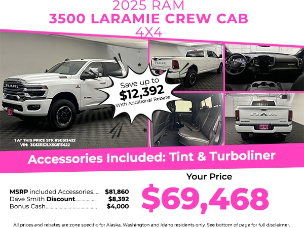 This 2025 Ram 3500 embodies class and sophistication with its refined white exterior. This 1 ton pickup has a 6 Cyl, 6.7L high output engine. When you encounter slick or muddy roads, you can engage the four wheel drive on this 2025 Ram 3500 and drive with confidence. This model has a diesel engine. Get the big jobs done with this one-ton truck. From hauling to towing it is ready for your toughest jobs.