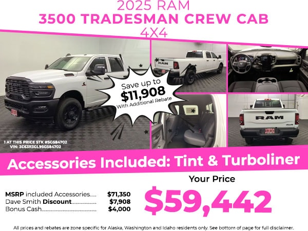 Cold Weather Group: Engine Block Heater; MOPAR Winter Front Grille Cover. Tradesman Level 1 Equipment Group: Convenience Group; Google Android Auto; SiriusXM Radio Service; Rear View Auto Dim Mirror; For Details Visit DriveUconnect.com; For More Info. Call 800-643-2112; Rear Power Sliding Window; Integrated Voice Command with Bluetooth; Connectivity - US/Canada; Emergency Vehicle Alert System (EVAS); Manual Folding Exterior Mirrors; 12 Touchscreen Display; Tinted Acoustic Windshield Glass; GPS Navigation; 4G LTE Wi-Fi Hot Spot; GPS Antenna Input; Exterior Mirrors with Heating Element; MOPAR Black Tubular Side Steps; SiriusXM with 360L; Global Telematics Box Module; Connected Travel and Traffic Services; Mirror Running Lights; Black Exterior Mirrors; Exterior 115V AC Outlet; Alexa Built-In; Carpet Floor Covering; Apple CarPlay; Power-Adjustable Convex Aux Mirrors; Off-Road Information Pages; Selectable Tire Fill Alert; Trailer Tow Pages; 400W Inverter; Cloth 40/20/40 Bench Seat; Disassociated Touchscreen Display; HD Radio; Power Heat Fold Telescopic Mirrors; Uconnect 5 Navigation with 12.0 Display Radio; Exterior Mirrors with Supplemental Signals; Exterior Mirrors Courtesy Lamps; Air Conditioning ATC with Dual Zone Control; 115-Volt Auxiliary Front Power Outlet; Manuarl Telescoping Mirrors; Power Adjust Mirrors; Front and Rear Floor Mats; ParkSense Front/rear Park Assist System. Quick Order Package 24A Tradesman. MOPAR Black Tubular Side Steps. Cloth 40/20/40 Bench Seat. **Equipment listed is based on original vehicle build and subject to change. Please confirm the accuracy of the included equipment by calling the dealer prior to purchase.**