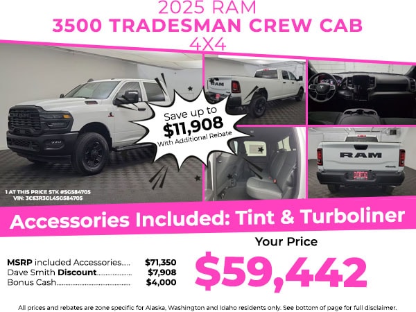 Cold Weather Group: Engine Block Heater; MOPAR Winter Front Grille Cover. Tradesman Level 1 Equipment Group: Convenience Group; Google Android Auto; SiriusXM Radio Service; Rear View Auto Dim Mirror; For Details Visit DriveUconnect.com; For More Info. Call 800-643-2112; Rear Power Sliding Window; Integrated Voice Command with Bluetooth; Connectivity - US/Canada; Emergency Vehicle Alert System (EVAS); Manual Folding Exterior Mirrors; 12 Touchscreen Display; Tinted Acoustic Windshield Glass; GPS Navigation; 4G LTE Wi-Fi Hot Spot; GPS Antenna Input; Exterior Mirrors with Heating Element; MOPAR Black Tubular Side Steps; SiriusXM with 360L; Global Telematics Box Module; Connected Travel and Traffic Services; Mirror Running Lights; Black Exterior Mirrors; Exterior 115V AC Outlet; Alexa Built-In; Carpet Floor Covering; Apple CarPlay; Power-Adjustable Convex Aux Mirrors; Off-Road Information Pages; Selectable Tire Fill Alert; Trailer Tow Pages; 400W Inverter; Cloth 40/20/40 Bench Seat; Disassociated Touchscreen Display; HD Radio; Power Heat Fold Telescopic Mirrors; Uconnect 5 Navigation with 12.0 Display Radio; Exterior Mirrors with Supplemental Signals; Exterior Mirrors Courtesy Lamps; Air Conditioning ATC with Dual Zone Control; 115-Volt Auxiliary Front Power Outlet; Manuarl Telescoping Mirrors; Power Adjust Mirrors; Front and Rear Floor Mats; ParkSense Front/rear Park Assist System. Quick Order Package 24A Tradesman. MOPAR Black Tubular Side Steps. Cloth 40/20/40 Bench Seat. **Equipment listed is based on original vehicle build and subject to change. Please confirm the accuracy of the included equipment by calling the dealer prior to purchase.**