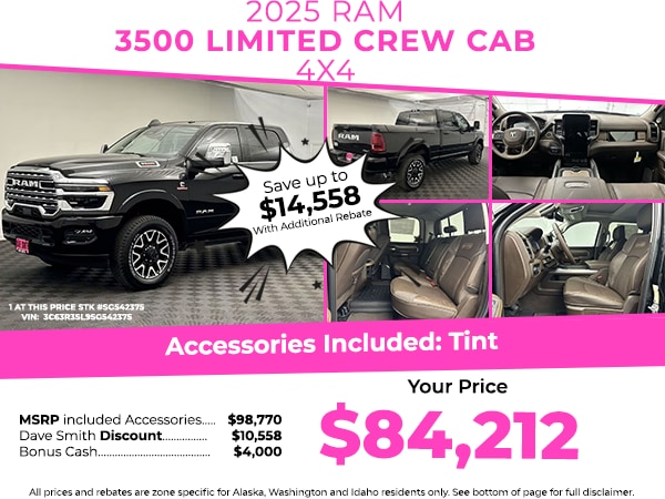 The installed navigation system will keep you on the right path. This 1 ton pickup's Forward Collision Warning feature alerts drivers to potential front-end collisions. See what's behind you with the back up camera on it. It comes equipped with Android Auto for seamless smartphone integration on the road. This Ram 3500 has automated speed control that adjusts to maintain a safe following distance, enhancing highway driving convenience. This 2025 Ram 3500 features a hands-free Bluetooth phone system. This Ram 3500 is pure luxury with a heated steering wheel. The leather seats in the Ram 3500 are a must for buyers looking for comfort, durability, and style. The vehicle offers Apple CarPlay for seamless connectivity. The Ram 3500 has four wheel drive capabilities. This Ram 3500 has a 6 Cyl, 6.7L high output engine. Set the temperature exactly where you are most comfortable in this model. The fan speed and temperature will automatically adjust to maintain your preferred zone climate.
