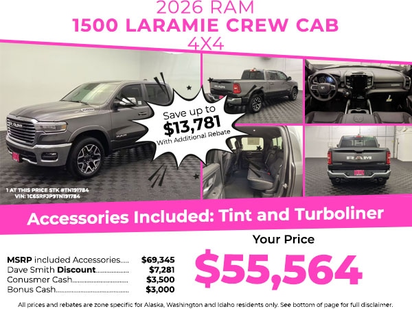 This vehicle's Forward Collision Warning system alerts the driver to potential front-end collisions, enhancing safety. This 2026 Ram 1500 keeps you comfortable with Auto Climate. The installed navigation system will keep you on the right path. This Ram 1500 features a hands-free Bluetooth phone system. Keep your hands warm all winter with a heated steering wheel in it . This Ram 1500 offers Apple CarPlay for seamless connectivity. The state of the art park assist system will guide you easily into any spot. This 1/2 ton pickup has auto-adjust speed for safe following. Never get into a cold vehicle again with the remote start feature on the vehicle. This 2026 Ram 1500 comes equipped with Android Auto for seamless smartphone integration on the road. The leather seats in this model are a must for buyers looking for comfort, durability, and style. See what's behind you with the back up camera on this unit.