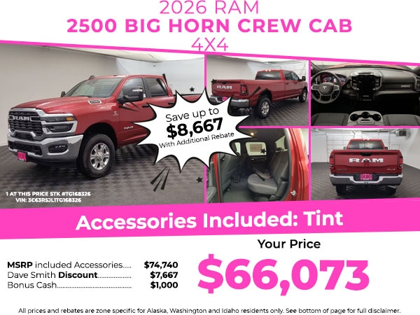 The rear parking assist technology on this 2026 Ram 2500 will put you at ease when reversing. The system alerts you as you get closer to an obstruction. The Ram 2500 offers Android Auto for seamless smartphone integration. The Ram 2500 has auto-adjust speed for safe following. Protect this 2026 Ram 2500 from unwanted accidents with a cutting edge backup camera system. This model offers Apple CarPlay for seamless connectivity. The Ram 2500 features a hands-free Bluetooth phone system. This vehicle's Forward Collision Warning feature alerts drivers to potential front-end collisions. Greater towing safety becomes standard with the installed trailer brake. This unit has a 6 Cyl, 6.7L high output engine. This unit has four wheel drive capabilities. The Ram 2500 gleams with a flashy red exterior. The fog lights cut through the weather so you can see what's ahead. The vehicle features cruise control for long trips. The Electronic Stability Control will keep you on your intended path.