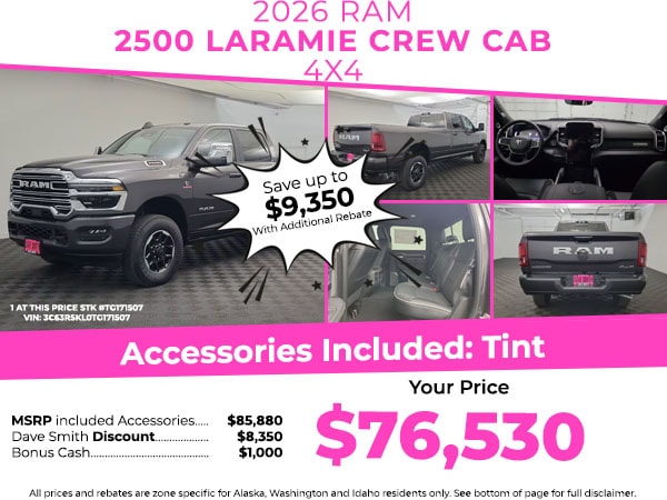 Start it from inside with remote start. This 3/4 ton pickup keeps you comfortable with Auto Climate. This Ram 2500 offers Android Auto for seamless smartphone integration. The installed navigation system will keep you on the right path. Protect this model from unwanted accidents with a cutting edge backup camera system. Bluetooth technology is built into this 3/4 ton pickup, keeping your hands on the steering wheel and your focus on the road. This Ram 2500 is pure luxury with a heated steering wheel. The leather seats in this Ram 2500 are a must for buyers looking for comfort, durability, and style. This 2026 Ram 2500 has automated speed control that adjusts to maintain a safe following distance, enhancing highway driving convenience. This 3/4 ton pickup's Forward Collision Warning feature alerts drivers to potential front-end collisions. This unit offers Apple CarPlay for seamless connectivity. The rear parking assist technology on the Ram 2500 will put you at ease when reversing. The system alerts you as you get closer to an obstruction.