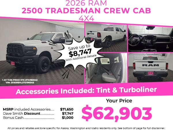 Cold Weather Group: Engine Block Heater; MOPAR Winter Front Grille Cover. Tradesman Level 1 Equipment Group: Google Android Auto; SiriusXM Radio Service; For Details. Visit DriveUconnect.com; For More Info. Call 800-643-2112; Integrated Voice Command with Bluetooth; Emergency Vehicle Alert System (EVAS); Manual Folding Exterior Mirrors; 12 Touchscreen Display; Auto Power-Folding Mirrors; 4 Way Front Headrests; Front Armrest with Cupholders; Anti-Spin Differential Rear Axle; Remote USB Port - Charge Only; Manual Adjust 4-Way Front Passenger Seat; Mirror Running Lights; Exterior 115V AC Outlet; Alexa Built-In; Apple CarPlay; Power-Adjustable Convex Aux Mirrors; Forward and Reverse Utility Lights; Cloth 40/20/40 Bench Seat; Disassociated Touchscreen Display; Storage Tray; 115-Volt Auxiliary Front Power Outlet; Rear View Auto Dim Mirror; 40/20/40 Split Bench Seat; Rear Power Sliding Window; Connectivity - US/Canada; Rear Folding Seat; Tinted Acoustic Windshield Glass; GPS Navigation; 4G LTE Wi-Fi Hot Spot; GPS Antenna Input; Exterior Mirrors with Heating Element; MOPAR Black Tubular Side Steps; SiriusXM with 360L; Global Telematics Box Module; Connected Travel and Traffic Services; Black Exterior Mirrors; 2 Way Rear Headrest Seat; Carpet Floor Covering; Off-Road Info Pages; Selectable Tire Fill Alert; Trailer Tow Pages; 400W Inverter; HD Radio; Power Heated Folding Telescope Mirrors; Uconnect 5 Navigation with 12.0 Display Radio; Exterior Mirrors with Supplemental Signals; Exterior Mirrors Courtesy Lamps; Air Conditioning ATC with Dual Zone Control; Manual Adjust 4-Way Driver Seat; Manuarl Telescoping Mirrors; Power Adjust Mirrors; Power Telescoping Mirrors; Front and Rear Floor Mats; ParkSense Front/rear Park Assist System. Convenience Group. Quick Order Package 24A Tradesman. Commercial Features Package. MOPAR Black Tubular Side Steps. Anti-Spin Differential Rear Axle. Cloth 40/20/40 Bench Seat. 50 Gallon Fuel Tank. Rear Wheelhouse Liners. **Equipment listed is based on original vehicle build and subject to change. Please confirm the accuracy of the included equipment by calling the dealer prior to purchase.**