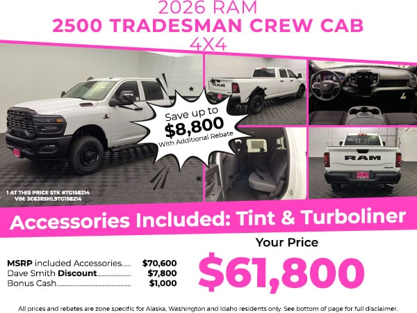 Cold Weather Group: Engine Block Heater; MOPAR Winter Front Grille Cover. Tradesman Level 1 Equipment Group: Google Android Auto; SiriusXM Radio Service; For Details. Visit DriveUconnect.com; For More Info. Call 800-643-2112; Integrated Voice Command with Bluetooth; Emergency Vehicle Alert System (EVAS); Manual Folding Exterior Mirrors; 12 Touchscreen Display; Auto Power-Folding Mirrors; 4 Way Front Headrests; Front Armrest with Cupholders; Anti-Spin Differential Rear Axle; Remote USB Port - Charge Only; Manual Adjust 4-Way Front Passenger Seat; Mirror Running Lights; Exterior 115V AC Outlet; Alexa Built-In; Apple CarPlay; Power-Adjustable Convex Aux Mirrors; Forward and Reverse Utility Lights; Cloth 40/20/40 Bench Seat; Disassociated Touchscreen Display; Storage Tray; 115-Volt Auxiliary Front Power Outlet; Rear View Auto Dim Mirror; 40/20/40 Split Bench Seat; Rear Power Sliding Window; Connectivity - US/Canada; Rear Folding Seat; Tinted Acoustic Windshield Glass; GPS Navigation; 4G LTE Wi-Fi Hot Spot; GPS Antenna Input; Exterior Mirrors with Heating Element; MOPAR Black Tubular Side Steps; SiriusXM with 360L; Global Telematics Box Module; Connected Travel and Traffic Services; Black Exterior Mirrors; 2 Way Rear Headrest Seat; Carpet Floor Covering; Off-Road Info Pages; Selectable Tire Fill Alert; Trailer Tow Pages; 400W Inverter; HD Radio; Power Heated Folding Telescope Mirrors; Uconnect 5 Navigation with 12.0 Display Radio; Exterior Mirrors with Supplemental Signals; Exterior Mirrors Courtesy Lamps; Air Conditioning ATC with Dual Zone Control; Manual Adjust 4-Way Driver Seat; Manuarl Telescoping Mirrors; Power Adjust Mirrors; Power Telescoping Mirrors; Front and Rear Floor Mats; ParkSense Front/rear Park Assist System. Convenience Group. Quick Order Package 24A Tradesman. MOPAR Black Tubular Side Steps. Anti-Spin Differential Rear Axle. Cloth 40/20/40 Bench Seat. 50 Gallon Fuel Tank. **Equipment listed is based on original vehicle build and subject to change. Please confirm the accuracy of the included equipment by calling the dealer prior to purchase.**