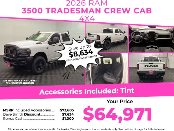 This 2026 Ram 3500 comes equipped with Android Auto for seamless smartphone integration on the road. This unit offers Apple CarPlay for seamless connectivity. This 1 ton pickup keeps you comfortable with Auto Climate. You'll never again be lost in a crowded city or a country region with the navigation system on the Ram 3500. This 1 ton pickup has auto-adjust speed for safe following. The rear parking assist technology on this Ram 3500 will put you at ease when reversing. The system alerts you as you get closer to an obstruction. This 2026 Ram 3500 features a hands-free Bluetooth phone system. See what's behind you with the back up camera on this Ram 3500. The vehicle has four wheel drive capabilities. Maintaining a stable interior temperature in this 2026 Ram 3500 is easy with the climate control system. Greater towing safety becomes standard with the installed trailer brake. This vehicle shines with clean polished lines coated with an elegant white finish.